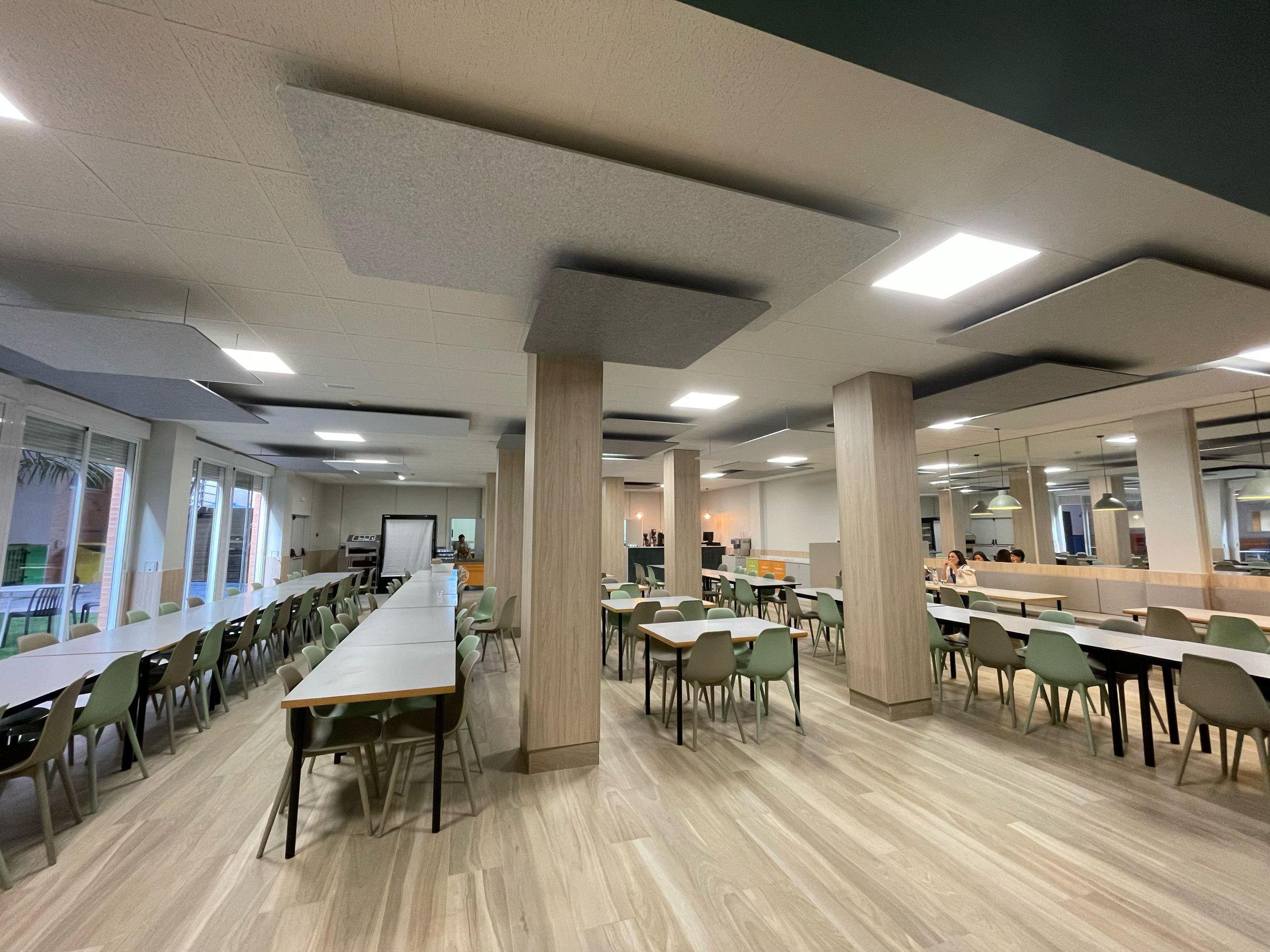 Además, en el techo se han instalado paneles fonoabsorbentes, para reducir el ruido y eco y crear un espacio más agradable durante las comidas.