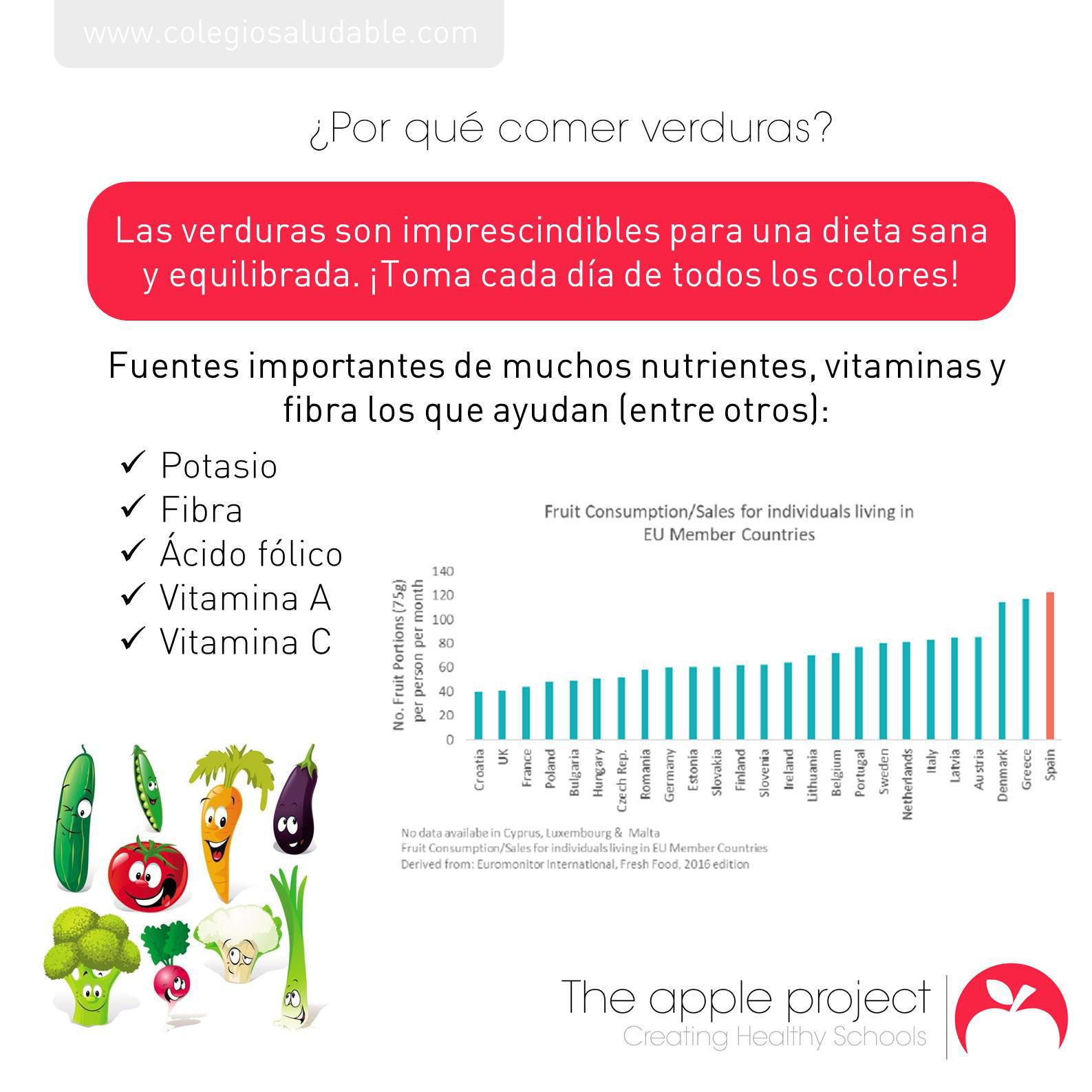 - Consumir al menos 400g o 5 raciones en total de frutas y verduras al día, a ser posible de colores variados.